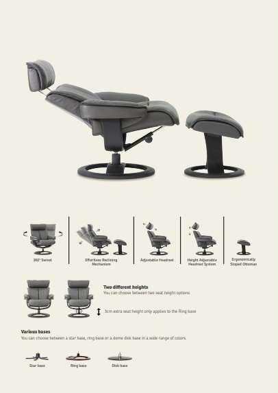The Nordic recliner range from IMG offers unsurpassed comfort with high quality and a truly Nordic design theme. The unique design with a laminated wood yoke and construction frames made of solid steel ensure unquestionable comfort, stability and long lasting quality. 2 sizes for the Perfect Fit (Standard or Large)